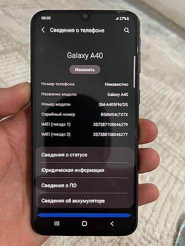 На скриншоте “Сведения о телефоне” указана модель Galaxy A40, номер модели SM‑A405FN/DS и два IMEI. Отличный выбор компактного AMOLED‑смартфона с двойной камерой и сканером отпечатка.