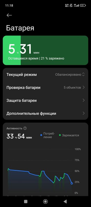 - Аккумулятор: на скриншоте 21% заряда, прогноз оставшегося времени — 5 ч 31 мин; режим «Сбалансировано».