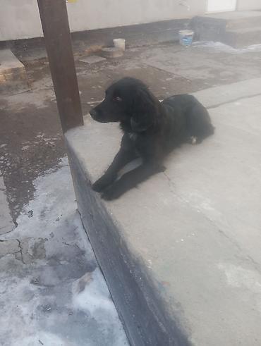 Спаниел русский Молодая собака среднего размера с длинной шерстью. Окрас — черный с небольшим белым пятном на груди и белыми отметинами на лапах. Уши висячие, хвост пушистый. Телосложение стройное, лапы длинные. Спокойный, внимательный взгляд, дружелюбное поведение на фото — спокойно лежит и наблюдает.