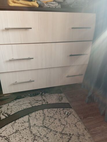 - Вместительная система хранения: полки в шкафу, три глубоких ящика комода, тумба для мелочей.