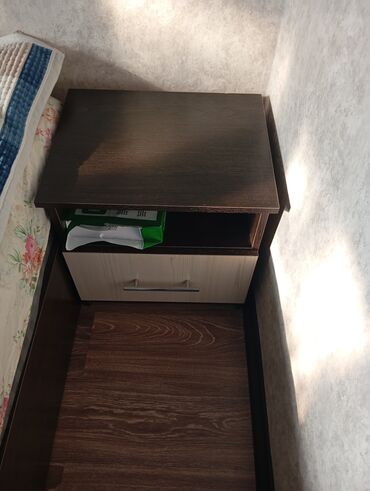 - Прикроватная тумба: открытая ниша + выдвижной ящик, верх и корпус в темном цвете, фасад светлый.