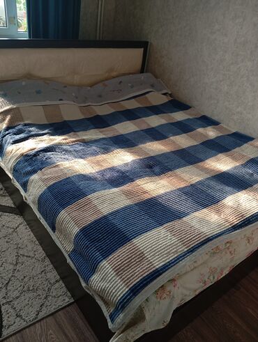 - Двуспальная кровать с мягким изголовьем. Каркас в темном цвете, нейтральная обивка изголовья.