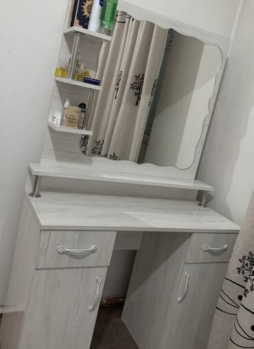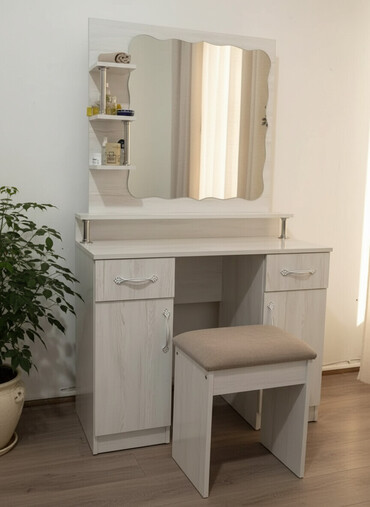 - Туалетный столик/трюмо с большим фигурным зеркалом. Столешница с дополнительной верхней полкой на металлических стойках, слева — открытые боковые полки для косметики и аксессуаров. В основании — выдвижные ящики и тумбы с дверцами.
