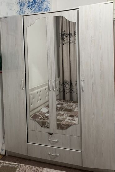 - Шкаф платяной 4-дверный с двумя зеркальными вставками по центру. Внизу — два выдвижных ящика; распашные створки с фигурными ручками.