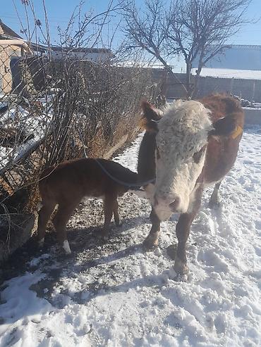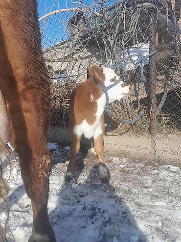 Предлагается к продаже теленок, отличающийся ярким окрасом — коричневый с белыми пятнами. Телёнок находится рядом с матерью, что свидетельствует о его хорошем здоровье и уходе. На теленке надет недоуздок, что указывает на приученность к обращению. Идеальный вариант для разведения или выращивания.