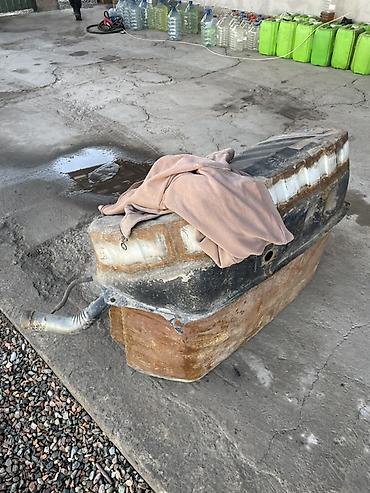 Металлический топливный бак (вероятно от грузового автомобиля/техники). Описание: - Материал: сталь, толстостенный. - Форма: прямоугольная, с округлыми краями. - Заливная горловина с металлической...