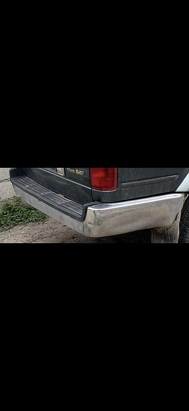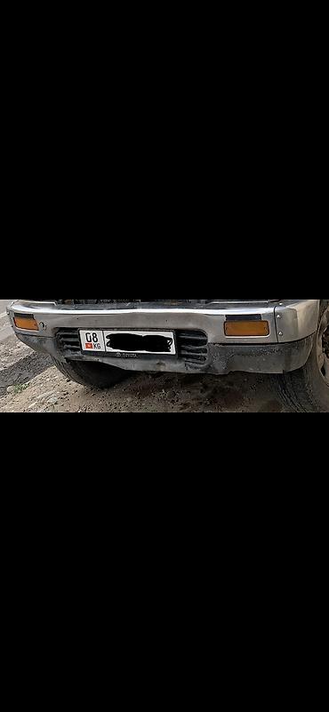 Тоета сюрф 130 Передний бампер для автомобиля. - Материал: пластик. - Цвет: верхняя часть серебристая, нижняя — черная. - Конфигурация: центральная решетка-воздухозаборник, места под противотуманн...
