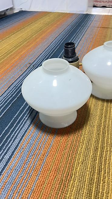 - Плафоны: 3 белых стеклянных плафона «галета» (молочное стекло), крепление через прижимные кольца.