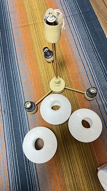 - Комплект: металлическое основание с тремя рожками, 3 стеклянных плафона, прижимные кольца для установки плафонов.