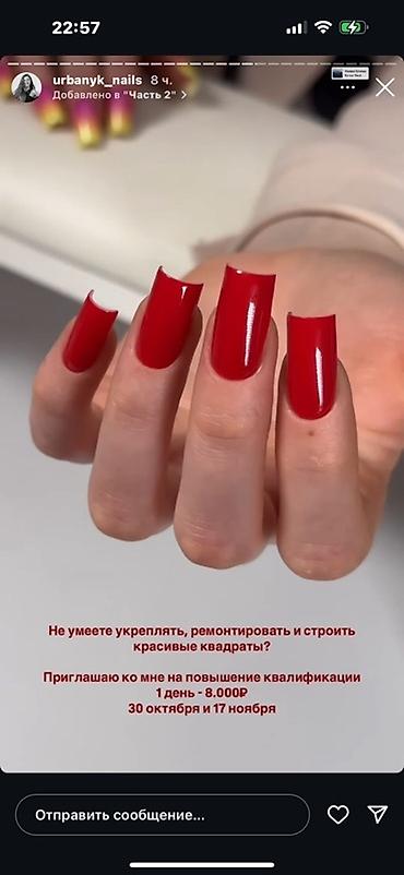 Маникюр и покрытие гель‑лаком/наращивание ногтей - Формы: квадрат, мягкий квадрат, миндаль; длина от короткой до экстра-длины. - Техники: классический и комбинированный маникюр, выравнивание ногте...