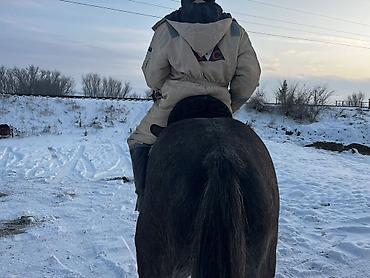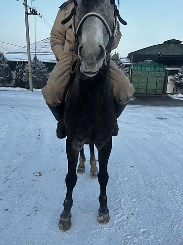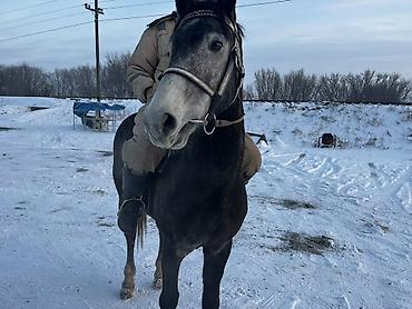Лошадь верхового типа, вороно-серая масть. На фото — под седлом и уздой, уверенно стоит и двигается по зимней площадке. Пропорциональное телосложение, крепкие конечности, широкая грудь и хорошо выраженная крупа. Густая грива и хвост, темные копыта. Подходит для прогулок и повседневной езды; комфортная посадка в рабочем аллюре. Спокойная реакция на окружающую среду и транспорт, не пугается посторонних звуков. Удобна в управлении: принимает поводы, четко реагирует на основные команды, идет ровно шагом и рысью.