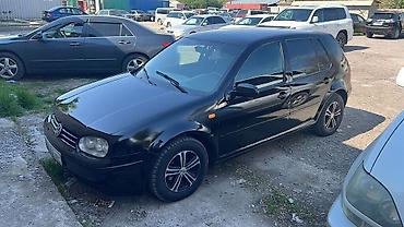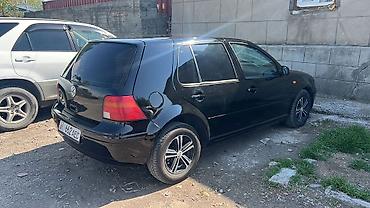 Volkswagen Golf IV, хэтчбек, черный цвет. Оригинальная эмблема VW на решетке радиатора, двухсекционные передние фары, противотуманные элементы в бампере. Кузов 5‑дверный, компактный и удобный для города. Лобовое стекло с тонированной верхней полосой, стеклоподъемники спереди, наружные зеркала черного цвета. Задние двери с треугольными форточками, антенна на крыше. Литые диски, всесезонные шины. Номерной знак: 03 KG 662 AEC.