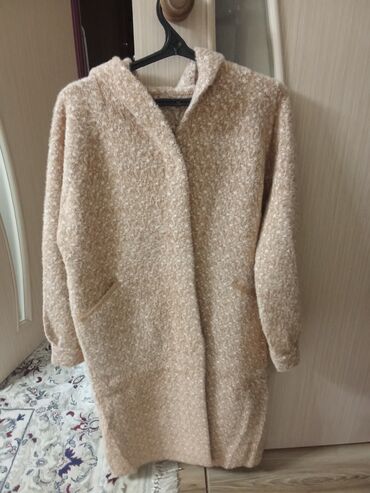 3) Бежевое пальто-халат из буклированной пряжи с капюшоном