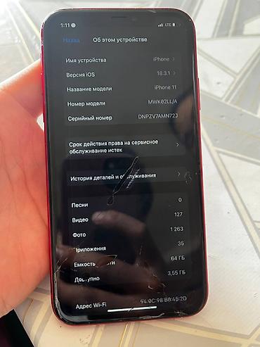 IPhone 11 (PRODUCT)RED, 64 ГБ Характеристики: - Модель: iPhone 11 (номер модели на фото: MWLT2Q/A) - Цвет: (PRODUCT)RED - Память: 64 ГБ (доступно ~50,8 ГБ — см. скрин на фото) - Дисплей: Liquid R...