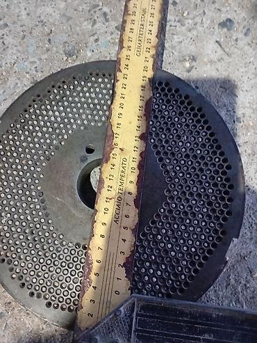 - Рабочая часть — матрица с отверстиями малого диаметра (на фото — сменные матрицы, ориентировочный диаметр около 30 см; набор с различным диаметром отверстий для регулировки размера гранул).