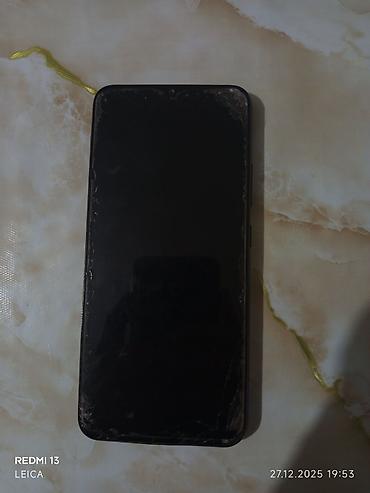 Смартфон с экраном около 6–. Корпус тёмный, фронтальная камера в верхней части дисплея по центру (каплевидный вырез). На экране видны трещины и следы эксплуатации; по периметру рамки — следы износа...