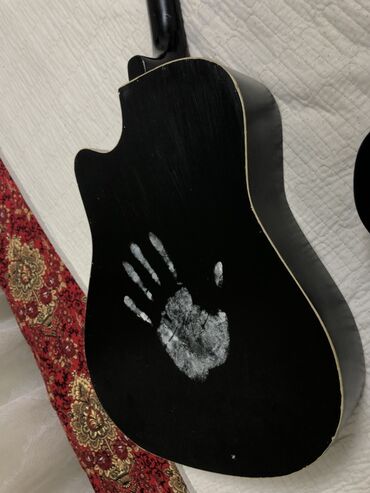 - Матовая черная окраска, на задней деке — декоративный отпечаток ладони белой краской.