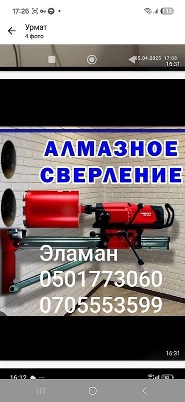 Услуга: алмазное бурение и резка бетона/кирпича. - Точные круглые отверстия под разные диаметры в бетоне, кирпиче, железобетоне. - Работы для: вентиляции, дымоходов, канализации, отопления, электр...