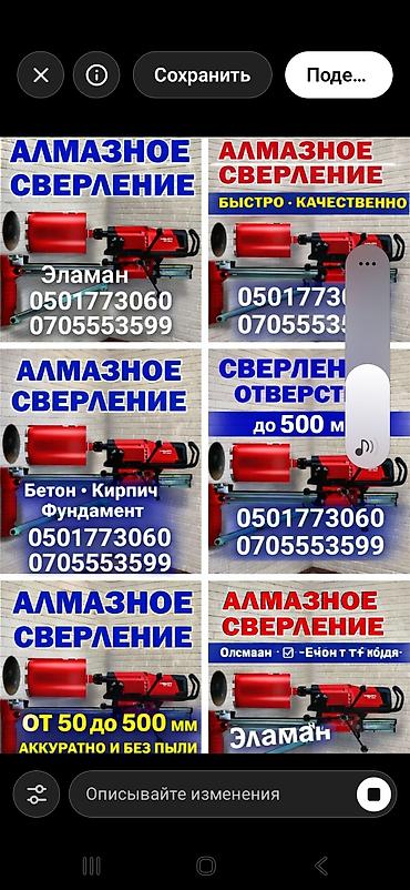 Услуга: алмазное бурение и резка бетона/кирпича. - Точные круглые отверстия под разные диаметры в бетоне, кирпиче, железобетоне. - Работы для: вентиляции, дымоходов, канализации, отопления, электр...