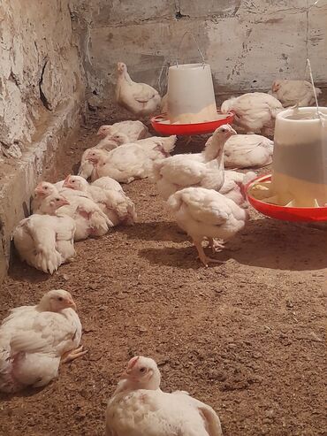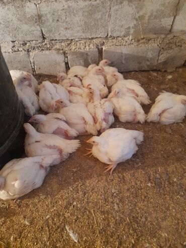 Бройлеры (мясные куры) Описание: - Белые бройлеры на напольном содержании. - Возраст: молодняк, уже переведён на полноценный рацион. - Кормление: комбикорм, доступ к воде через поилки-лотки по лин...
