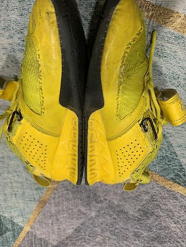 - Подошва: чёрно‑жёлтая, резиновая, с выраженным рисунком протектора и амортизирующими вставками по центру.