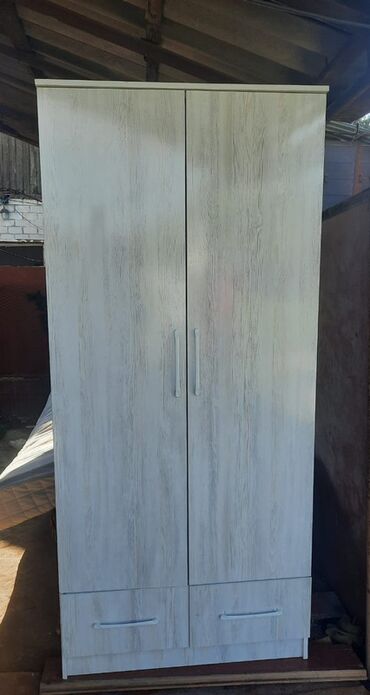 Двухдверный шкаф для одежды с зеркалом. Адрес : ж/ м кок жар улица ой терскен Характеристики: - Материал: ЛДСП, светлый древесный декор с выраженной текстурой. - Фасад: две распашные двери; н...