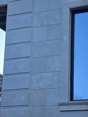 - Форм‑фактор: крупноформатные плиты и угловые элементы с рельефными рустами (3D-накладки), оконные обрамления и пояски.