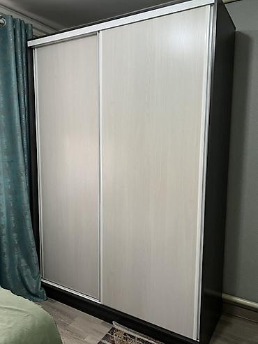 - Шкаф-купе двухдверный: фасады из ЛДСП светлого тона, алюминиевые направляющие, темный корпус. Компактный, при этом вместительный — экономит место за счет раздвижных дверей.