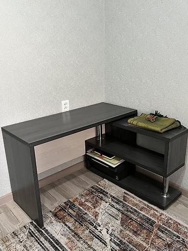 - Письменный стол углового типа: прямая столешница и приставной модуль с полками на металлических опорах. Удобно разместить принтер, папки и канцелярские принадлежности.