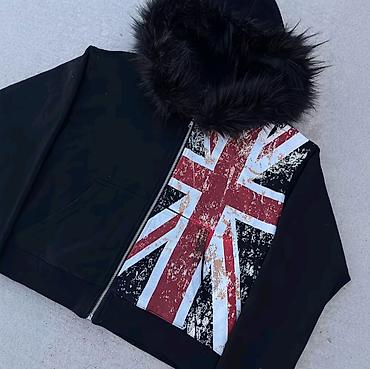 - Принт: крупный флаг Union Jack в винтажном/«потертом» стиле по правой полочке