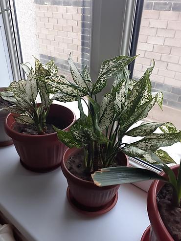 1) Аглаонема с мраморной бело‑зелёной вариегатностью. Компактные кустики в пластиковых горшках с поддонами. Декоративная листва освежает интерьер.