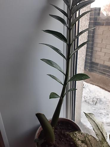 2) Замиокулькас (долларовое дерево) с крупным клубнем и длинным вертикальным побегом.