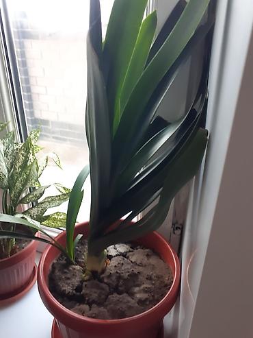 3) Кливия с веерообразной розеткой жёстких тёмно‑зелёных листьев, в отдельном горшке с поддоном.