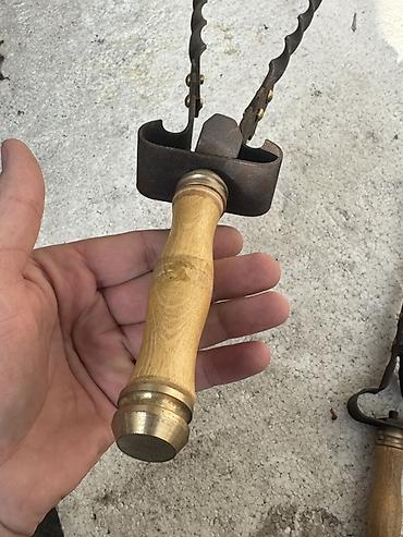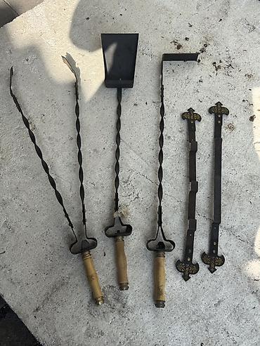 - Комплект кованых аксессуаров ручной работы: щипцы, совок и держатель/подставка.