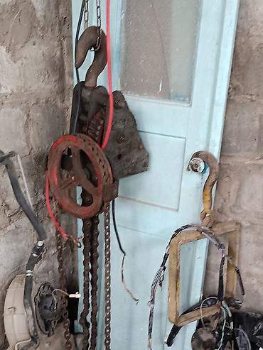 - В комплекте видны: блок с шестернями, звёздочка под приводную цепь, грузовые цепи и крюк.