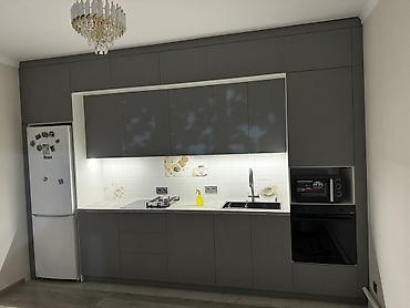 2 комнатная квартира в аренду - Линейный кухонный гарнитур: верх – светлые фасады без ручек, низ – серые фасады; столешница и фартук под камень. - Варочная панель газовая на 4 конфорки, встраивае...