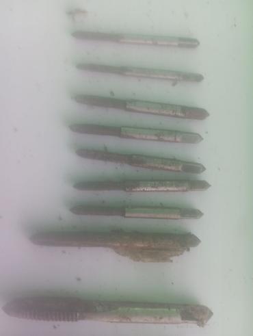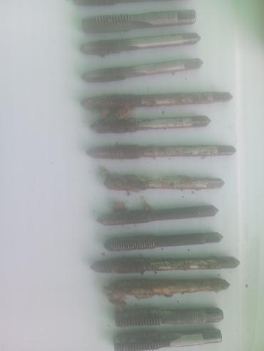 - Набор метчиков для нарезания резьбы. На фото — ассортимент разных диаметров и шагов (от мелких до средних), прямые стружечные канавки, квадрат под вороток/держатель. Есть как стартовые, так и проходные/дозакаленные варианты.