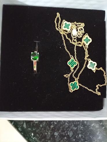 - Комплект с зелёными вставками: кольцо с круглой зелёной вставкой в центральной закрепке и цепочка/колье с подвесками в форме четырёхлистника, вставки с продольным рисунком в тон кольцу. Тонкая якорная/кабельная цепь золотистого цвета.