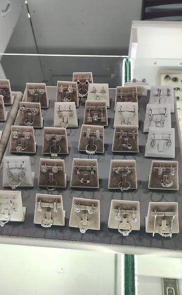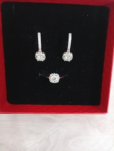 - Набор в красной коробке: серьги-подвески и кольцо с белыми камнями. Центральные камни округло-квадратной формы, оправа усыпана мелкими камнями.