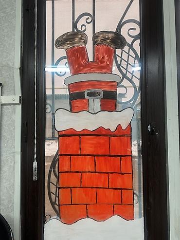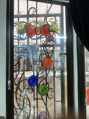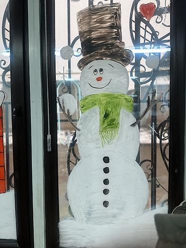 - Авторская декоративная роспись на стекле праздничными сюжетами: подарки с бантами, снежинки, игрушки-шары, бант с еловыми ветками, снеговик в шарфе и цилиндре, Санта в дымоходе.