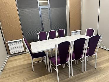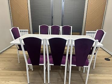 - 8 стульев в комплекте. Каркас металлический (белый), высокая фигурная спинка. Обивка сидений и спинок — бархат/велюр насыщенного фиолетового цвета.