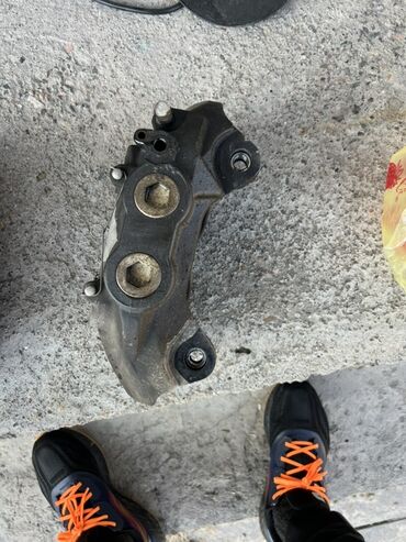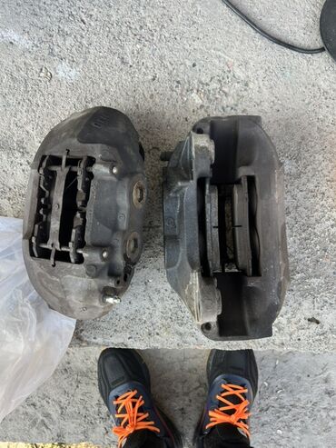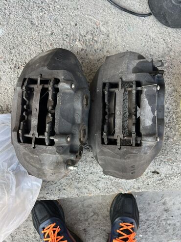 - Комплектация: оба суппорта в сборе с направляющими/пальцами и фиксаторами колодок; штуцеры под шланги/прокачку на местах. Тормозные колодки установлены как образец (износ на фото).