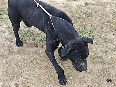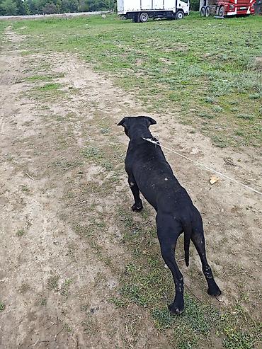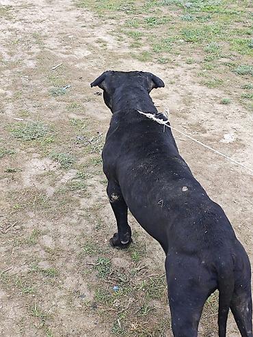 Собака крупного формата, короткошерстная, окраса чёрный. Корпус мощный и приземистый, широкая грудь, короткая шея, крупная голова с широкой мордой и висящими ушами. Хвост средней длины, лапы крепкие. На фото собака на поводке-верёвке. Подойдёт для охраны участка или двора и как компаньон активным людям. Требуется простор для выгула и физические нагрузки. Короткая шерсть удобна в уходе: периодическое вычёсывание, контроль за кожей, стандартные обработки от паразитов. Собака ориентирована на человека, внимательная к окружению.