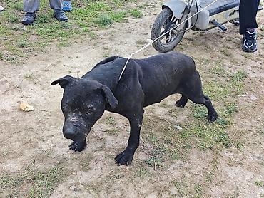 Собака среднего размера, короткошёрстная, мускулистого телосложения. Окрас однотонный тёмный. Уши полустоячие, хвост прямой. На фото — на ошейнике и цепи, в вольерных условиях двора. Рядом — пласти...