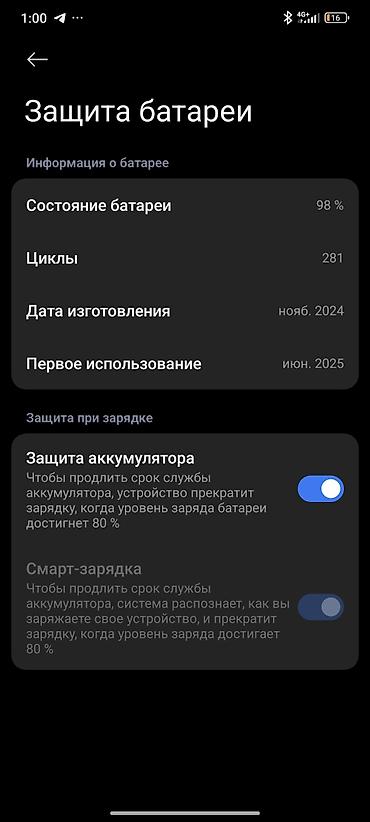 - Батарея с поддержкой функций “Защита аккумулятора” и “Смарт‑зарядка” (можно ограничивать заряд до 80% для продления срока службы). На скриншоте: состояние батареи 98%, 281 цикл, дата изготовления батареи — ноябрь 2024, первое использование — июнь 2025.