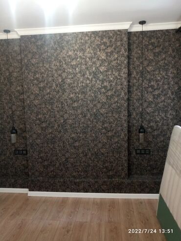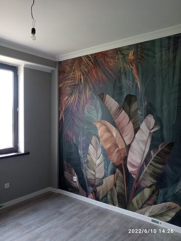 Результат на фото: стена с нишами и подвесными светильниками, оклейка крупным тёмным орнаментом; фотообои с тропическим принтом на выделенной стене, ровные стыки, чистые примыкания к плинтусу и багету.