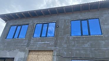 - Окна: установлены современные ПВХ-окна с темным профилем и двойными стеклопакетами, большие световые проемы по периметру второго этажа и части первого.