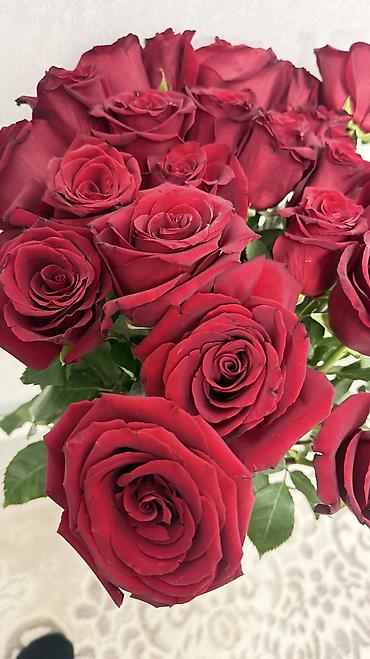 Букет из красных роз - Классический букет крупных бархатистых красных роз с насыщенным цветом. - Количество в букете: около 25–31 шт. (на фото — плотная круглая шапка из роз). - Длина стебля: высо...