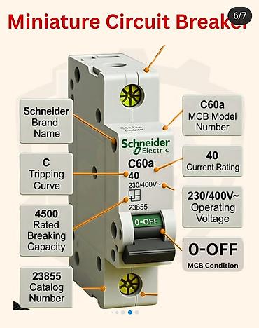 - Подбор, установка и проверка автоматических выключателей (MCB) с нужной характеристикой отключения (тип C), номиналом тока (например, 40 A), предельной отключающей способностью (например, 4500 А) и рабочим напряжением 230/400 В. Работаем с брендами уровня Schneider Electric, CHiNT и др.