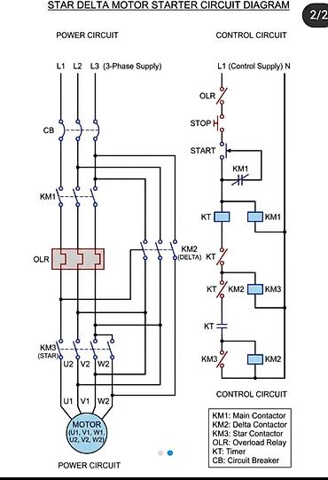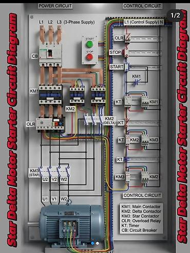 - Сборка и настройка шкафов управления электродвигателями по схеме «звезда–треугольник» (Star-Delta): силовая и управляющая части, контакторы KM1/KM2/KM3, тепловое реле перегрузки OLR, таймер KT, кнопки START/STOP, автоматический выключатель CB. Подключение обмоток U1–V1–W1/U2–V2–W2 с корректной коммутацией.